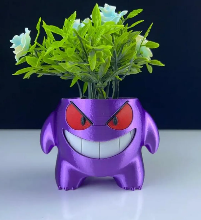 Bring some mischievous charm to your space with this adorable 3D printed Gengar planter! This beloved Ghost-type Pokemon makes the perfect home for your favorite small plants, succulents, or air plants. With his signature purple color and that iconic grin, Gengar will add a playful touch to any desk, windowsill, or shelf.