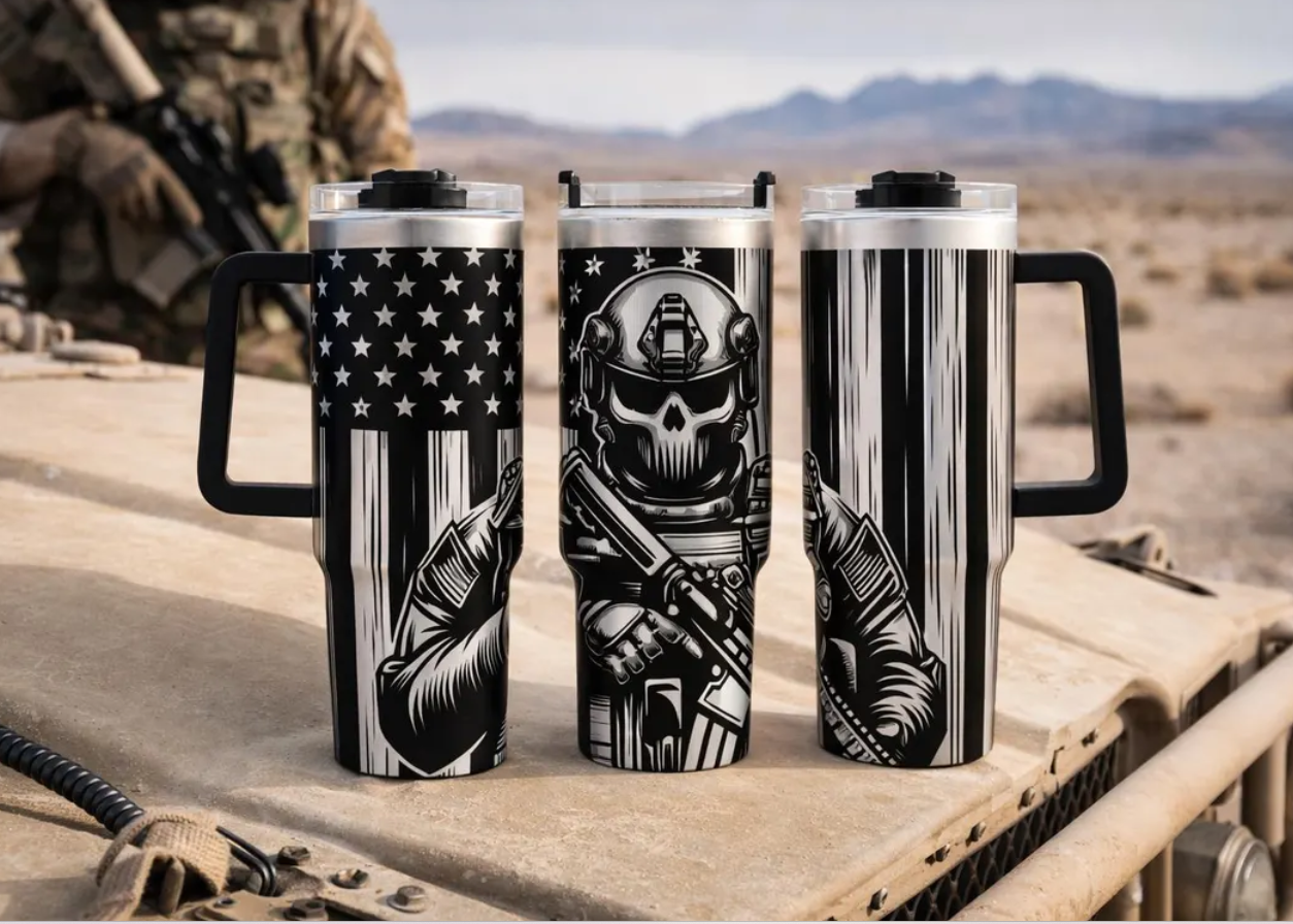 This custom laser-engraved tumbler combines a bold tactical design with everyday durability. Each tumbler is engraved directly into the stainless steel surface, creating a permanent design that will never crack, peel, or wash away.